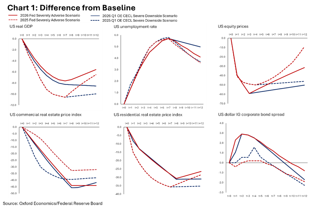 The 2026 severely adverse scenario introduces a more structured and transparent design, with a greater reliance on a published macroeconomic model to ensure consistency across key variables such as GDP, unemployment and inflation. Although the overall narrative remains broadly similar to previous stress tests, it has been updated to reflect conditions at the time of publication. This includes a refined global market shock component that targets areas of heightened risk, alongside a more explicit treatment of financial market stress.