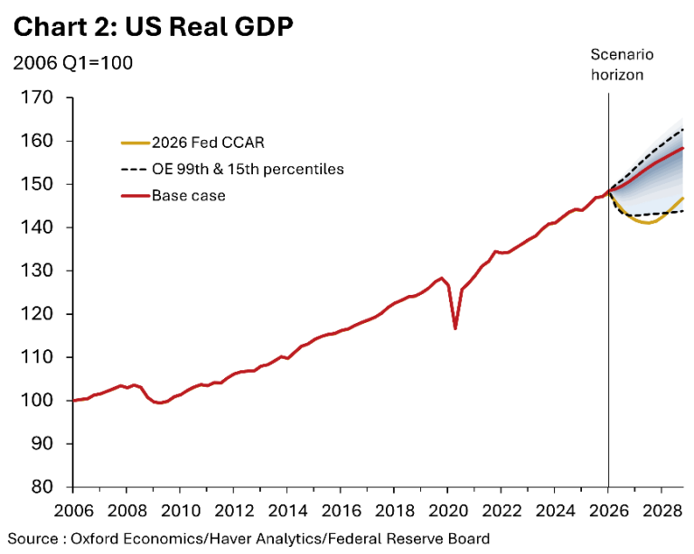 Compared with the 2025 exercise, the key change lies in how risks are calibrated. Under the new methodology, the downturn in GDP and residential housing is somewhat less pronounced, while pressure on commercial real estate prices, equities and corporate credit spreads are more severe. This reflects both a greater reliance on the macro model to anchor the path of the US economy, new “jump-off” conditions, and continued global uncertainty that increases the importance of macroeconomic risks. As a result, additional stress is applied to financial markets and conditions to capture how these risks may transmit to the wider economy.