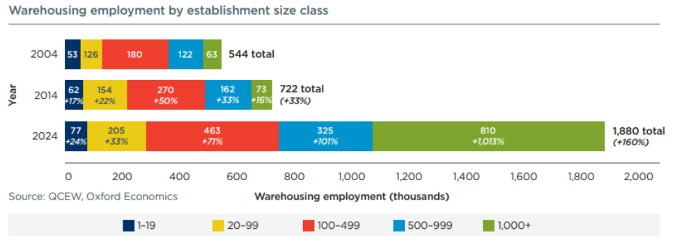 - US warehousing employment has nearly tripled from 2014 to 2024, rising from 749,000 to 1.9 million. This increase has been driven by the rapid expansion in mega‑facilities with over 1,000 workers.
