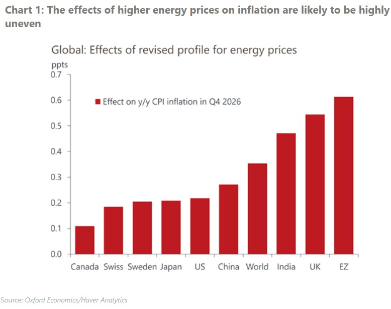 • Using our Global Economic Model, our updated energy price assumptions suggest that inflation in Q4 this year for the UK and Eurozone will be roughly 0.5ppts-0.6ppts higher than previously expected – a greater impact than elsewhere.