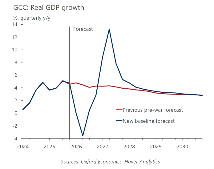 We’ve downgraded aggregate GCC real GDP growth for 2026 by 4.6ppts from our pre-war view to -0.2%, reflecting reduced oil production, exports, tourism, and domestic demand.