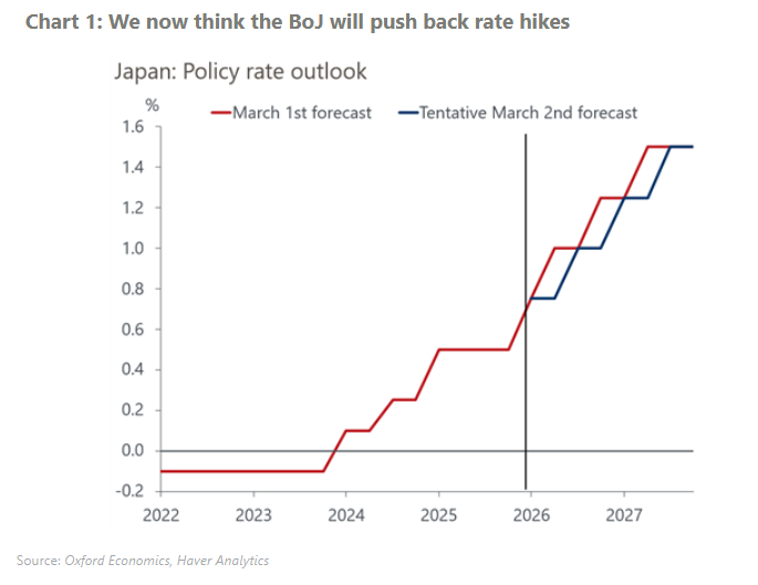 The Bank of Japan (BoJ) kept its policy rate at 0.75% at its March meeting. We now project the central bank will delay the next rate hike to July from June given the economy could fall into stagflation. Thereafter, the bank is projected to continue gradual rate hikes in Q1 and Q3 2027.