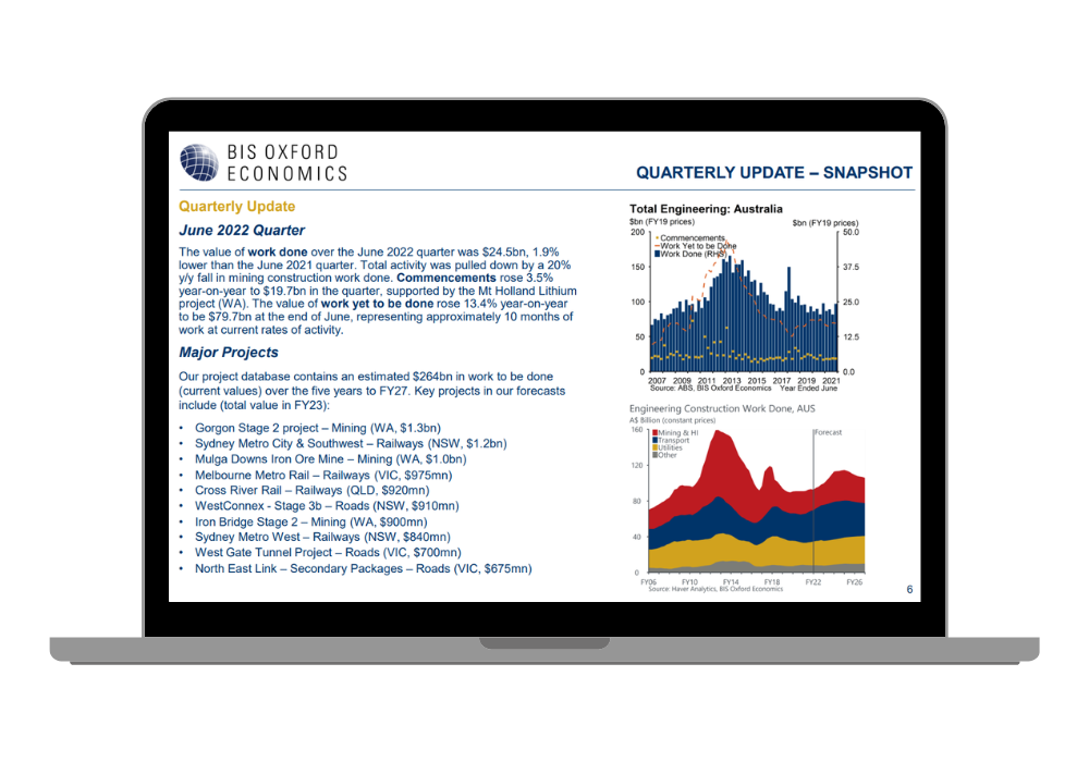 Oxford Economics Australia tracks all major mining investment projects by commodity and provides annual forecasts of production and construction each quarter.